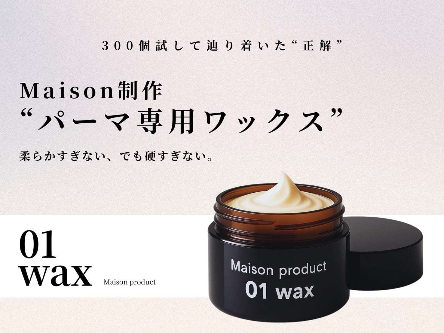 Maison Product Wax 01は、神戸・大阪を中心に展開するヘアサロン「Maison」の現場から生まれた、300種類以上ヘアワックスを試した毛利がお客様の声をもとにプロ目線で設計したスタイリングワックスです。